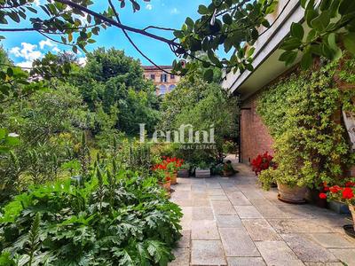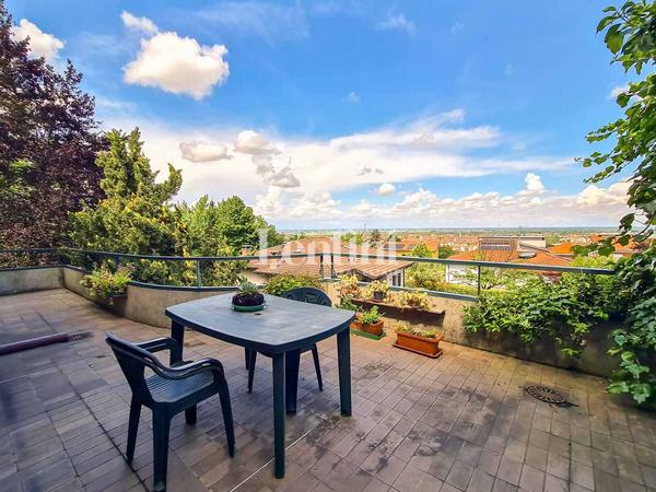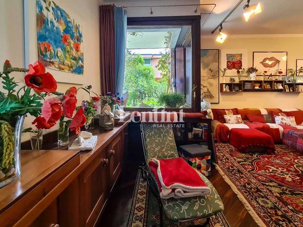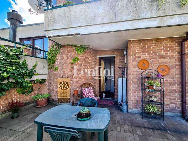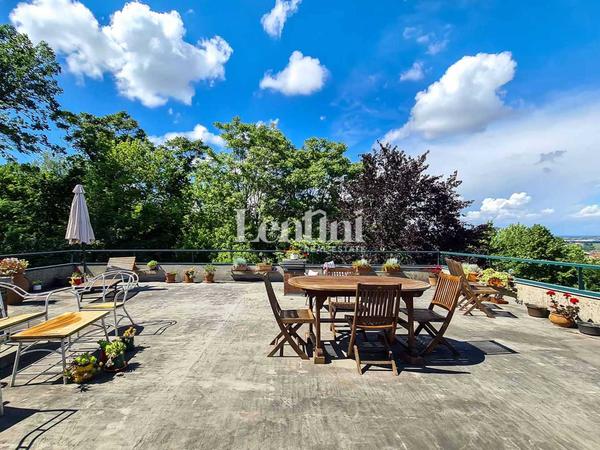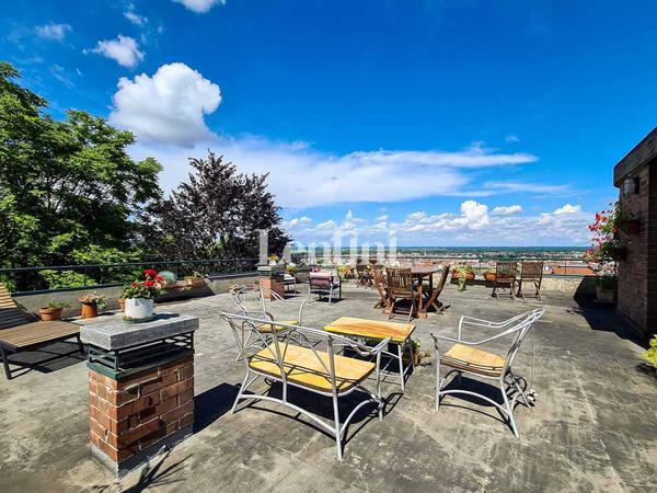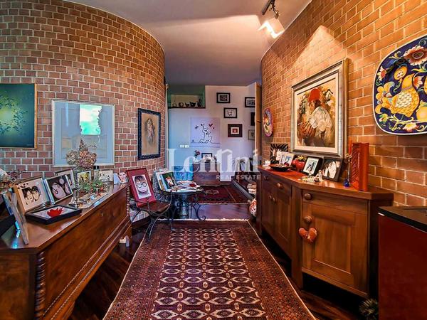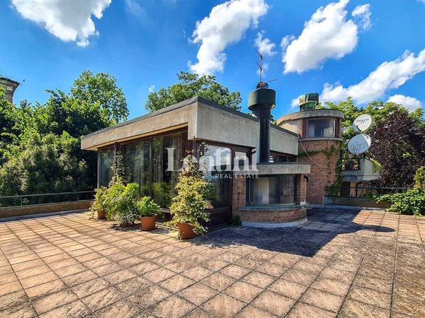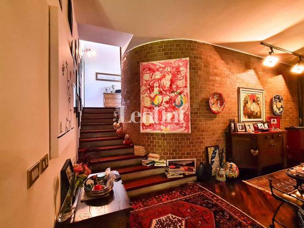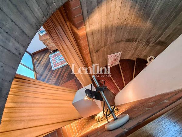 The elliptical wooden staircase, nestled inside the brick tower, leads to the upper floor. Here, a welcoming open space surrounded by glass windows houses a sleeping area and a bathroom, with access to a second large panoramic terrace. This 360-degree terrace offers outstanding views of the city and features a barbecue area.