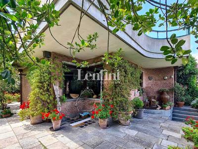 The building, made entirely of reinforced concrete, features a central circular structure that houses a tower with a staircase connecting the various floors. The villa is surrounded by the foliage of its lush garden, enriched by colorful plants and flowers.