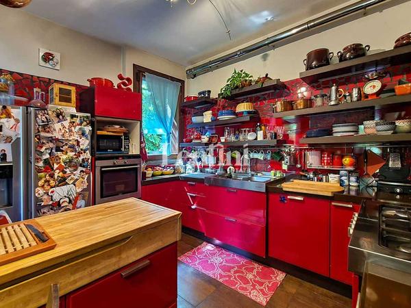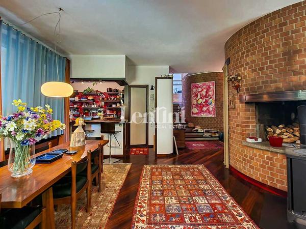 At the entrance, the warmth of the dark oak parquet flooring and the bright red of the brick walls welcome visitors, leading them to the living room with large windows that offer views of the front garden and the reserved back garden. The circular brick structure houses a fireplace that provides additional warmth to the living area. The modern, open kitchen is divided from the dining area by a handy peninsula.