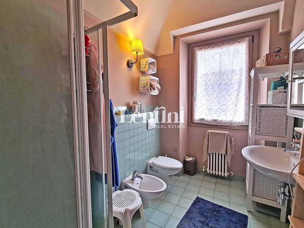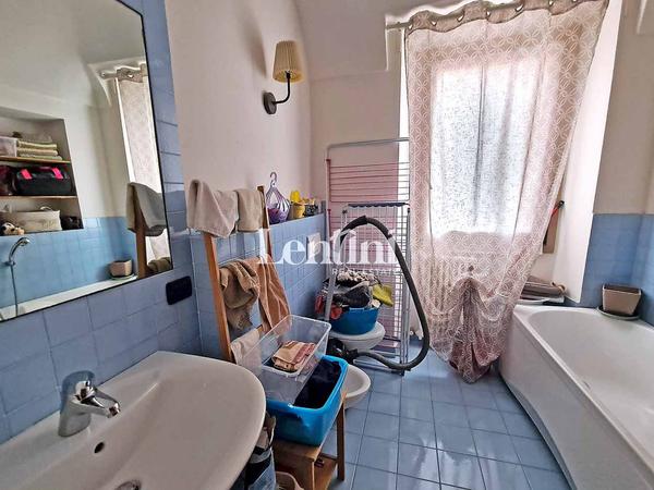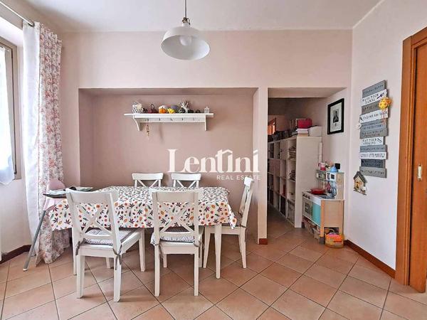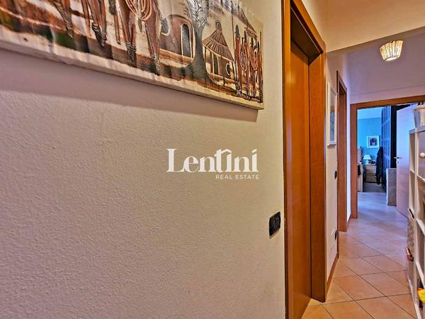 The house is located on the second floor and is in perfect living condition. The entrance opens onto the large and bright living room with dining area. The kitchen, practical and functional, is separated from the dining area by a sliding door. A corridor leads to the sleeping area where we find two bedrooms and two bathrooms, one with shower and one with bathtub. The balcony with access from the living room offers a pleasant view of the green garden and the panorama of the surrounding hills. As appurtenances of the property there are a garage, a parking space and a cellar.