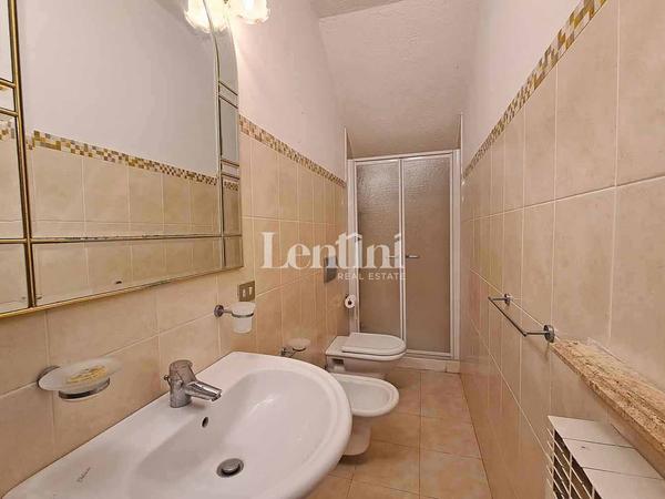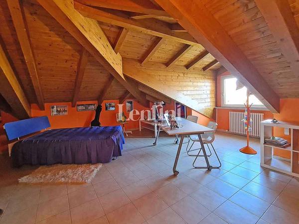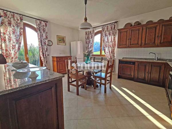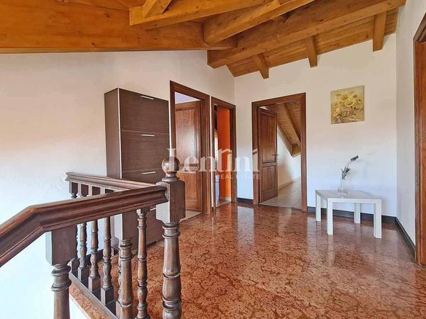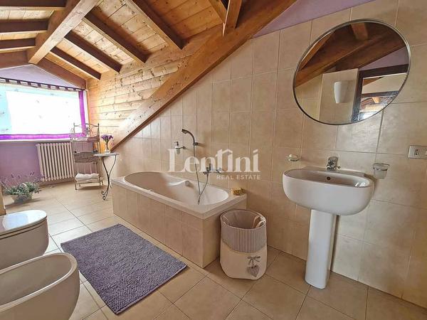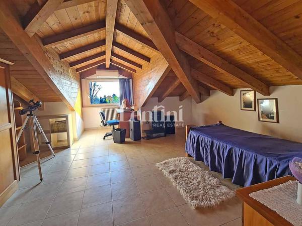 The second floor houses a flat with a spacious entrance hall, a double living room, a large kitchen overlooking a wide terrace, two bedrooms and two bathrooms. Lastly, the attic floor, distinguished by its exposed-beam ceilings, offers three bedrooms and a bathroom complete with bathtub.